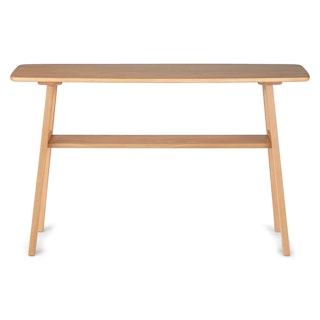 Upstanding citizen. The Kirun console in oak has legs for days, and they are made from solid wood. Beautiful curved detailing on the solid wood top makes this table a subtle stunner, ready to show off your ceramics collection, hold your keys, and proffer a beautiful vase of flowers to visiting guests.