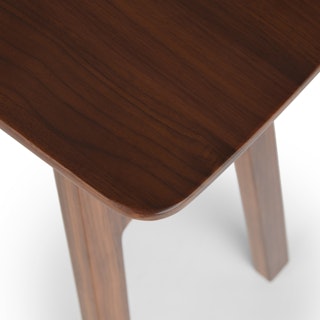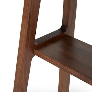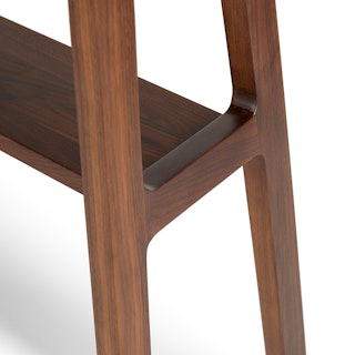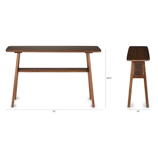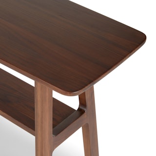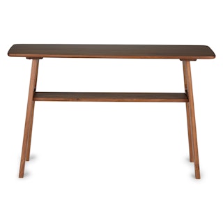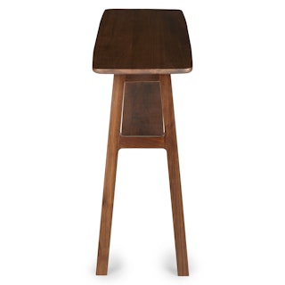 Straight and narrow. The Kirun console table features two places to store and show off your favorite travel trinkets or coffee table books. Beautiful detailing on the solid wood legs and curved solid wood top make for a piece that is eye catching without being demanding. A real stand-up piece.