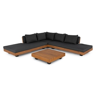 Get low. It will be love at first sight when you lay eyes (and then your whole body) on the Lubek Sectional Set. The L-shaped sectional features a solid acacia wood base and is complimented by structured yet comfortable weather-resistant cushions. Where will you put your snacks, you ask? The Lubek Coffee Table is just the spot. With matching solid acacia wood construction, it’s the perfect companion. This set was meant to be.