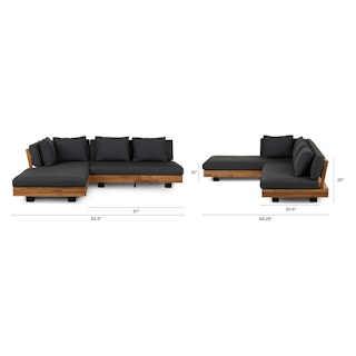 Stay a while. The Lubek sectional is built from a solid acacia wood base. The sofa is set close to the ground, encouraging you to really sink into (or even lie down on) those weather-resistant cushions. Dark cushions and super clean lines add to the Lubek’s modern look, while the warmth of the acacia wood makes the sofa easy to pair with any backyard set up. We call this look “low key modernism."