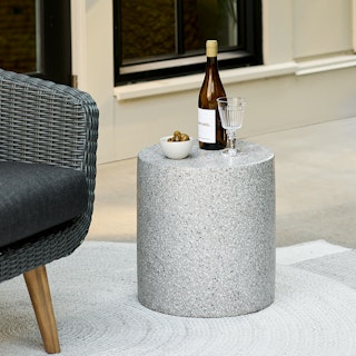 You're trying to RELAX, not compile a spreadsheet of specific cleaning methods per outdoor furniture piece. That's why we made the low maintenance bundle. The Aby's resin wicker seat and powder-coated legs are easy to clean. Upholstered with 100% Olefin, the cushions are weather and stain resistant. The Solina — stoic, queenly, cute — is molded from terrazzo concrete.