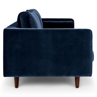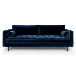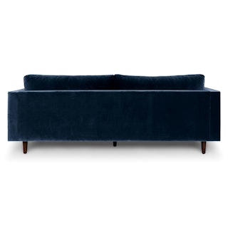 This blue velvet sofa is royally sweet. With its plush back cushions, bolsters made for regal lounging, and tufted bench seat, this Cascadian Blue version of our Sven Sofa holds court in your living room. This piece is poised on a wooden block frame and upholstered in soft brushed velvet. Go ahead: take your spot on this velvet throne.