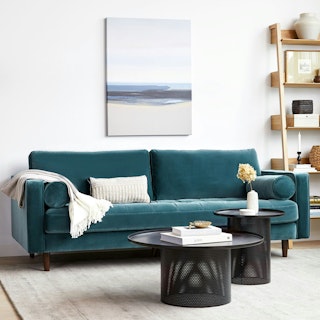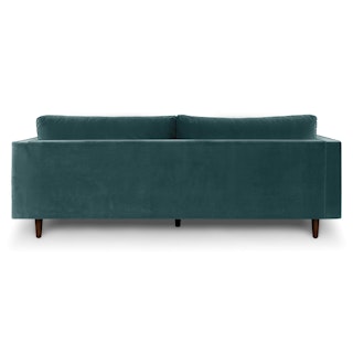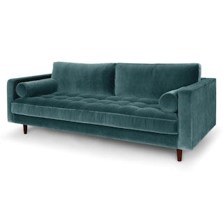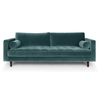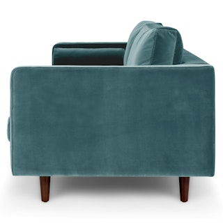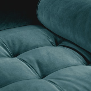 The Sven pacific blue velvet sofa is flirty, but it always toes the line. Relax into its tufted seat, nestle into its luxuriously plump cushions, enjoy its cotton-brushed velvet: this blue velvet sofa is here to support you. Loose rounded bolsters act as styling accents with substance: stack them for lumbar support. Stop staring at its online profile: this sofa is a keeper.