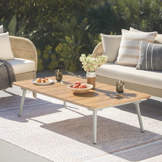 Farmhouse, but design-forward. Made from Acacia wood and powdered black metal, the Latta coffee table updates rustic materials with a modern shape and accoutrements. Imagine it laden with bowls of chips and a charcuterie board. Sounds like a perfect summer afternoon.